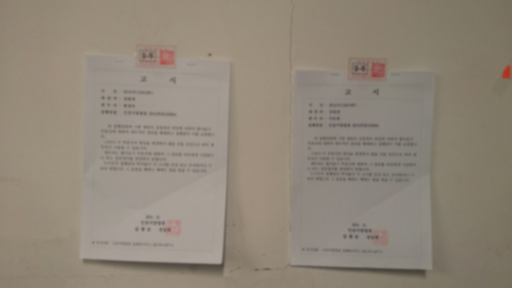 임대목적물 내부 벽면에 점유이전금지가처분 고시문 부착 사진 / 집행관의 가처분 집행 페이지 정보 작성자 (220.♡.167.96) 작성일18-03-29 18:50 조회4,237회 댓글0건 관련링크 이전글 다음글 목록 본문 임차인 1명, 무단전차인 1명을 상대로 점유이전금지가처분신청을 하고 결정을 받아 집행관으로 하여금 가처분집행을 실시함집행관은 집행목적물 내부에 "점유를 타인에게 이전하지 말라'는 취지의 고시문을 내부벽면에 부착함,채무자가 2명이므로, 각 1부 씩 부착하였음 댓글목록 등록된 댓글이 없습니다. 이전글 다음글 목록